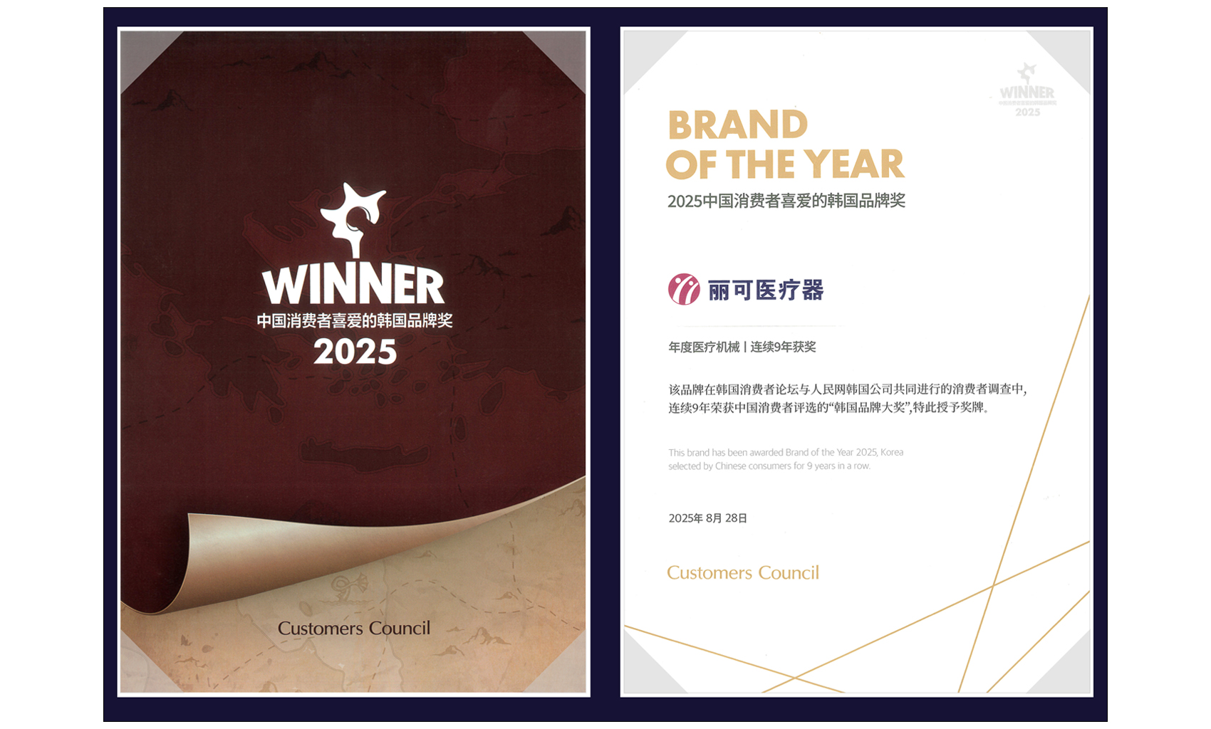 近日,在第23屆韓國品牌大獎評選中,麗可醫(yī)療器連續(xù)第九年被評為“中國消費者喜愛的韓國品牌獎”。